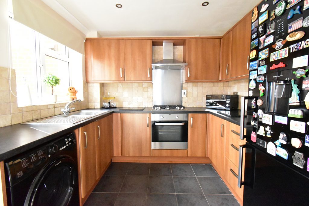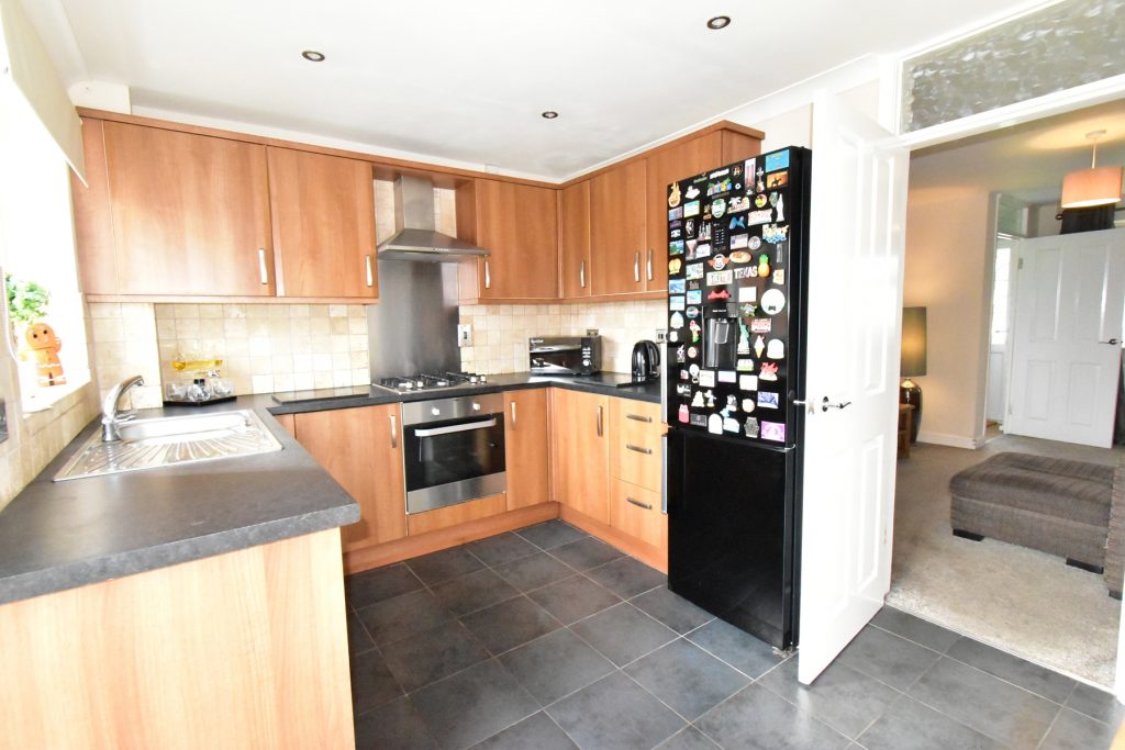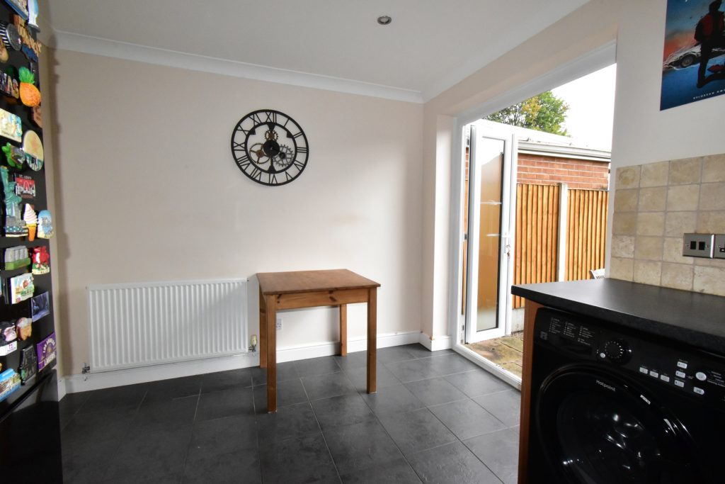 Fitted with a range of wall and base units in a wood effect finish with coordinating roll top work surfaces, part wall tiling, space and plumbing for a washing machine, space and plumbing for a fridge freezer, integrated oven, four ring gas hob, extractor fan, splashback, one and a half bowl single drainer sink with mixer tap, window to the rear, patio doors to the rear, radiator, power and ceiling spotlights.