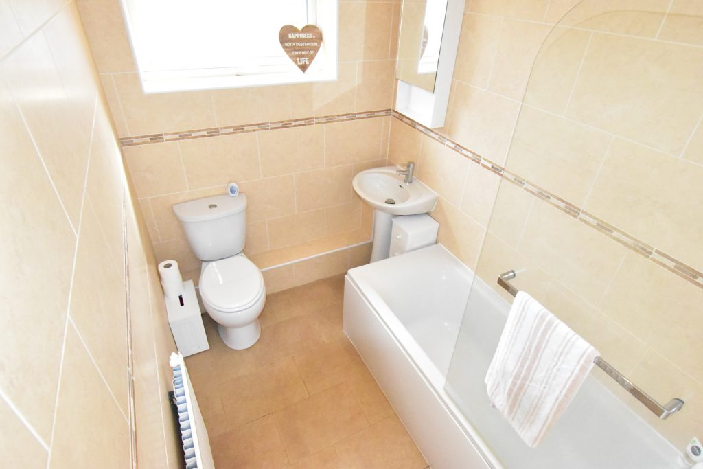 White three piece suite comprising of a wash hand basin, W.C. and a bath with shoer over, fully tiled walls, radiator, opaque window to the rear and ceiling light point.