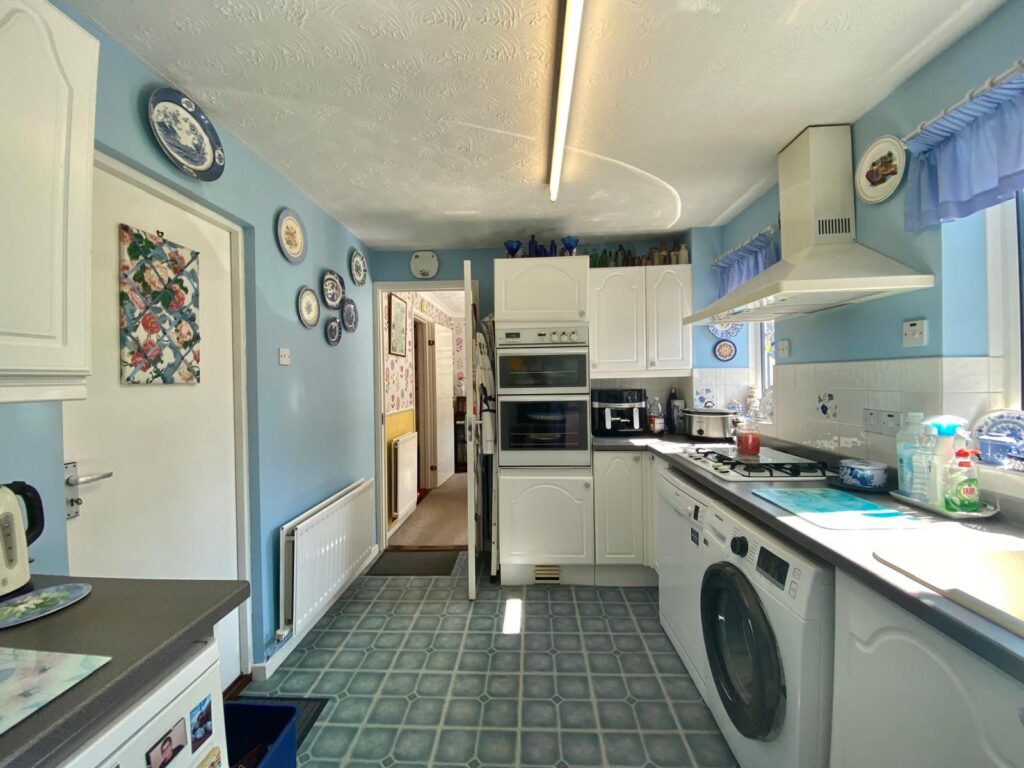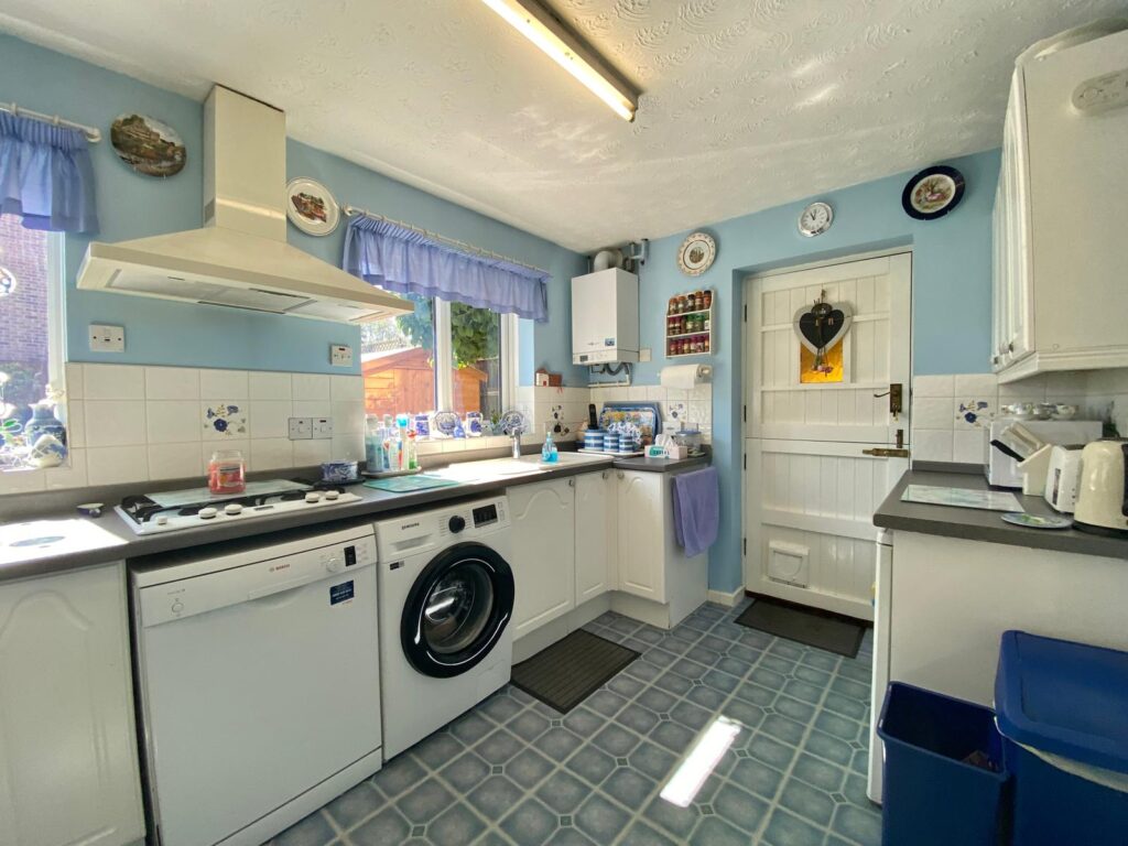 Fitted with a range of wall and base units in a white finish with coordinating work surfaces, part wall tiling, space and plumbing for a washing machine, space and plumbing for a fridge freezer, integrated oven, four ring gas hob, extractor fan, single drainer sink with mixer tap, UPVC double glazed windows to the rear, door to the side, radiator, power and ceiling light points.