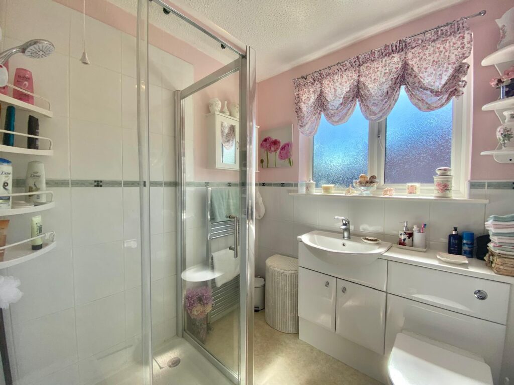 White suite comprising of a wash hand basin and W.C. built into vanity unit and a shower cubicle, part tiled walls, UPVC double glazed window, chrome towel radiator and ceiling light point.