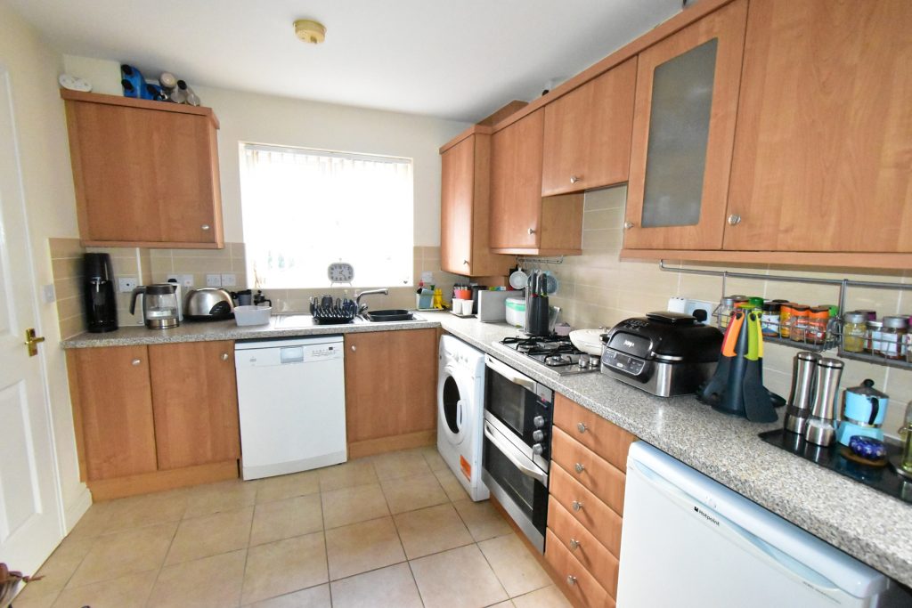 There are a range of wall and base units with roll top work surfaces and coordinated tile surround, single drainer stainless steel sink with mixer tap, built in extractor over a four ring gas hob, integrated electric oven and grill, space and plumbing for washing machine, space and plumbing for dishwasher, space for fridge, ceiling light point, radiator, power points, UPVC double glazed window to the front and UPVC double glazed door opening onto the side/rear of the property.