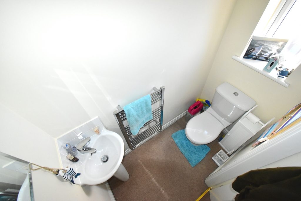 With close coupled W.C, corner pedestal wash hand basin with tiled splash back, chrome towel rail radiator, ceiling light point and UPVC double glazed opaque window to the front.