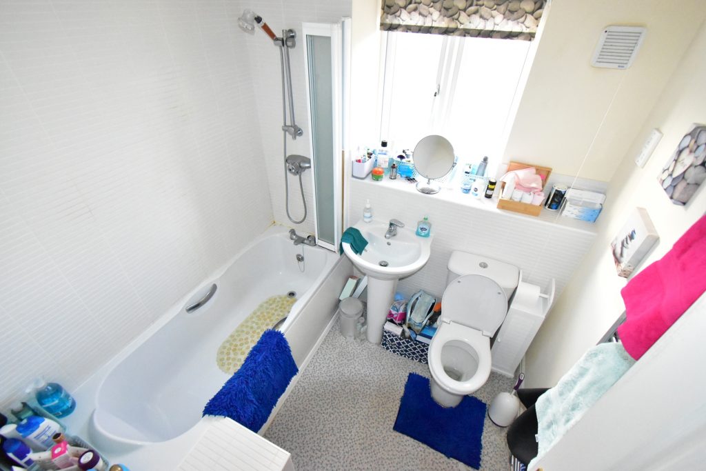 Fitted with a modern three-piece white suite incorporating panelled bath with shower over and folding shower screen, close coupled W.C, and pedestal wash hand basin with chrome mixer tap. There is a UPVC double glazed opaque window to the front, partial wall tiling and ceiling light point.