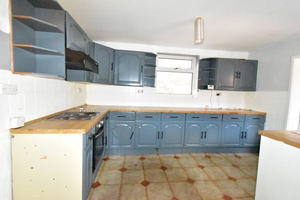 Fitted with a range of wall and base units in a blue wood finish with coordinating work surfaces, part wall tiling, integrated oven, four ring electric hob, extractor fan, space and plumbing for a washing machine, space and plumbing for a fridge freezer, single drainer sink with mixer tap, two windows, door to the rear, radiator, power and ceiling light points.