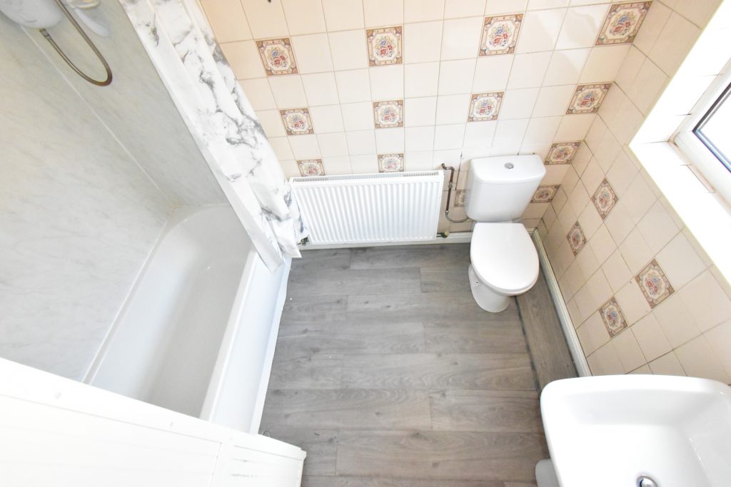 White three-piece suite comprising of a wash hand basin, W.C. and bath with shower over, fully tiled walls, opaque window to the side, radiator and ceiling light point.