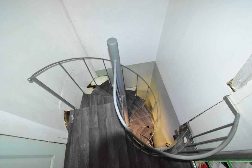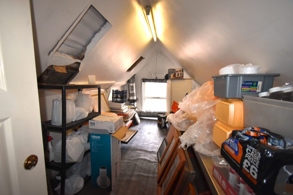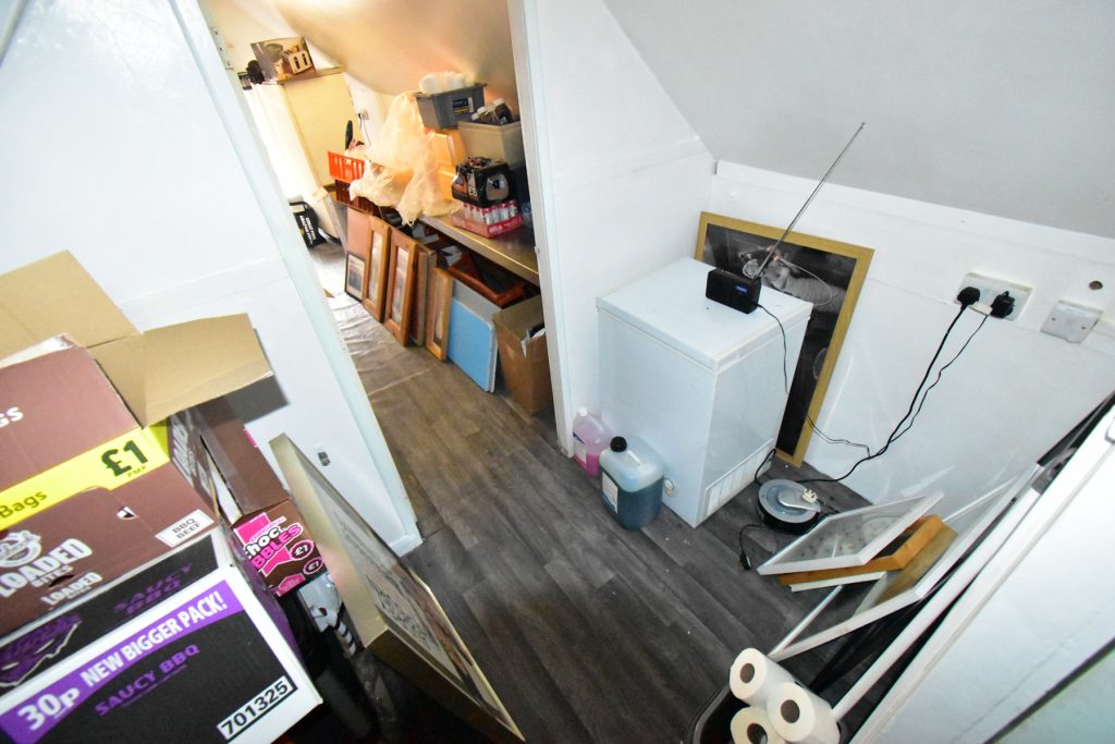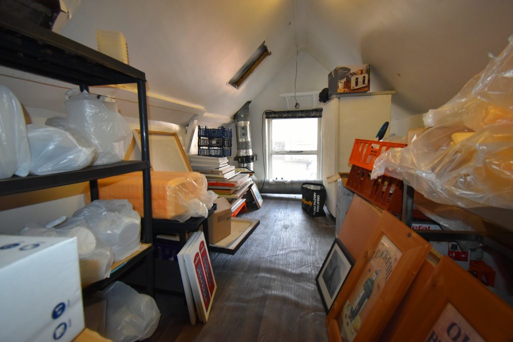 With a spiral staircase leading up, the ceiling of the whole second floor follows the roof line of the property and is divided into a small storage area, a W.C and a larger storage area.