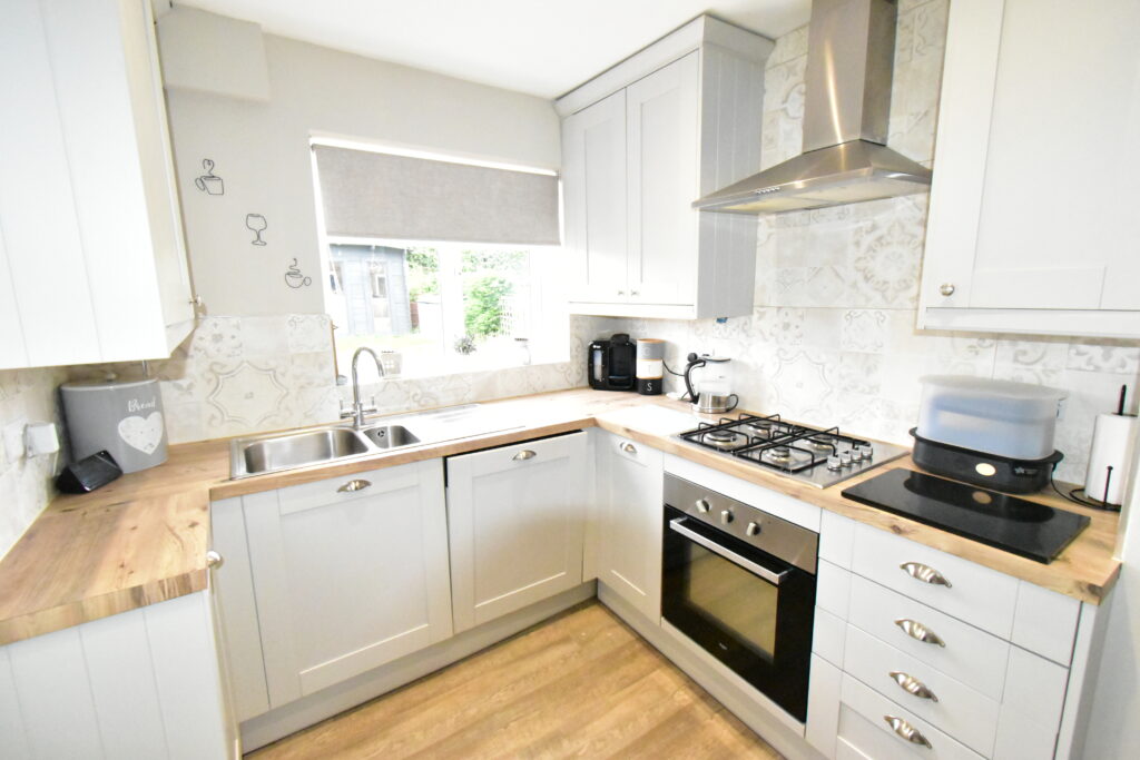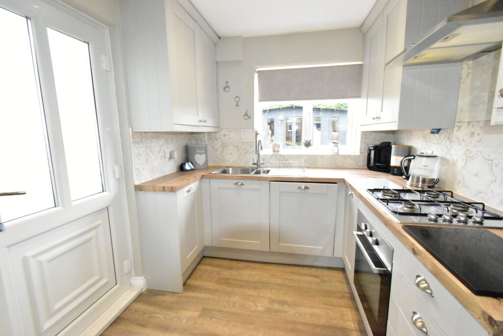 Fitted with a range of wall and base units in a grey finish with coordinating work surfaces, part wall tiling, integrated dishwasher, integrated oven, four ring gas hob, extractor fan, one and a half bowl single drainer sink with mixer tap, UPVC double glazed window to the rear, UPVC double glazed door to the side, radiator, power and ceiling light points.