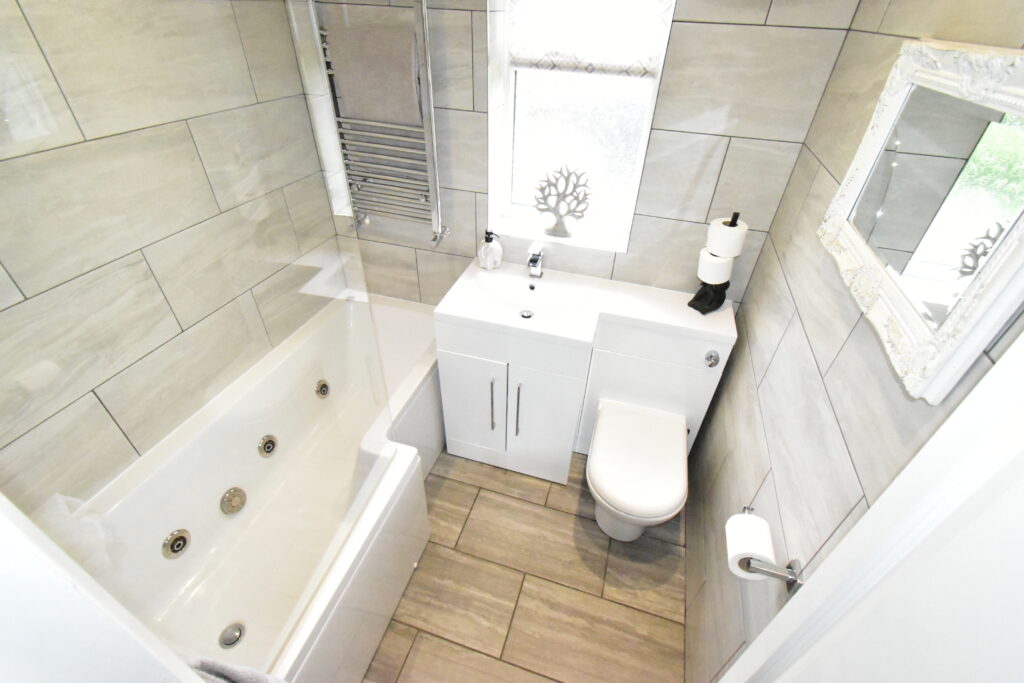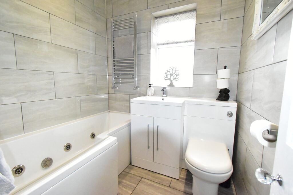 White three piece suite comprising of a wash hand basin built into vanity, a W.C. and jacuzzi bath with shower over, fully tiled walls, UPVC double glazed window, chrome towel radiator and ceiling light point.