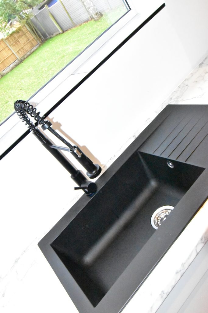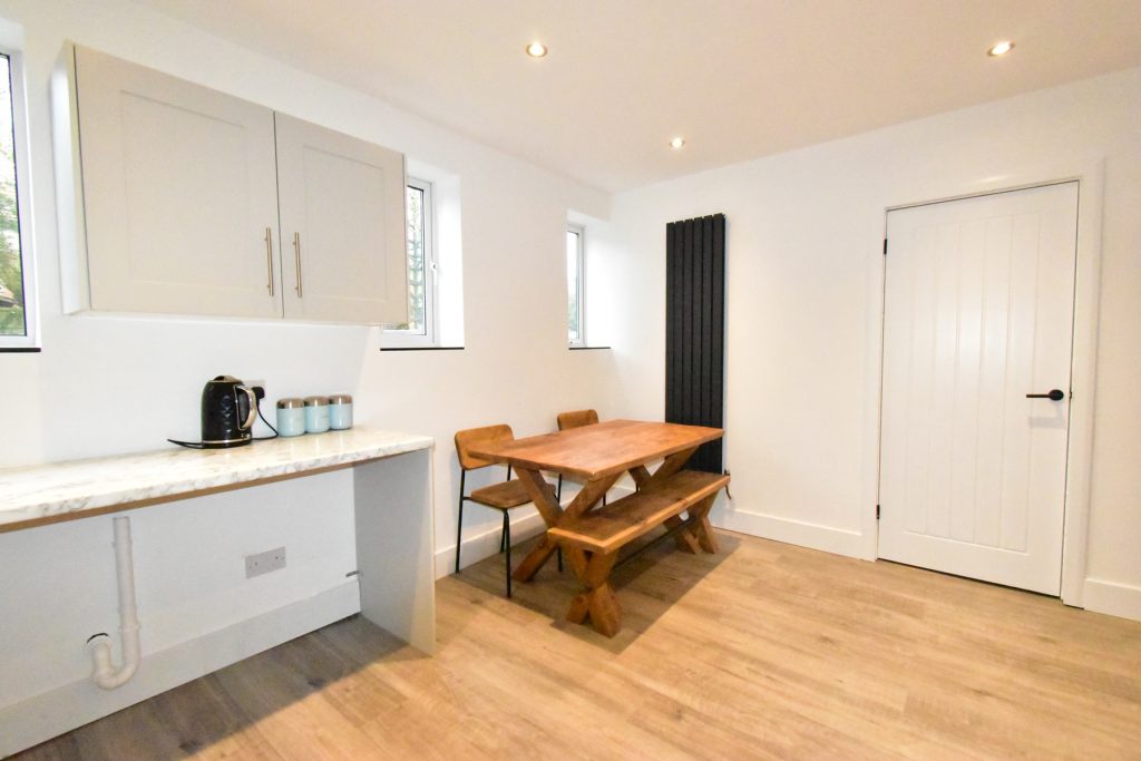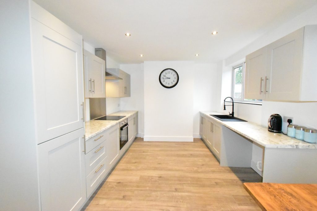 Brand new kitchen fitted with a range of wall and base units in a white finish with coordinating marble effect roll top work surfaces, space and plumbing for a washing machine, space and plumbing for a fridge freezer, integrated oven, four ring hob, stainless steel splashback, extractor fan, single drainer sink with mixer tap, understairs storage, UPVC double glazed windows to the rear, radiator, power and ceiling spotlights.