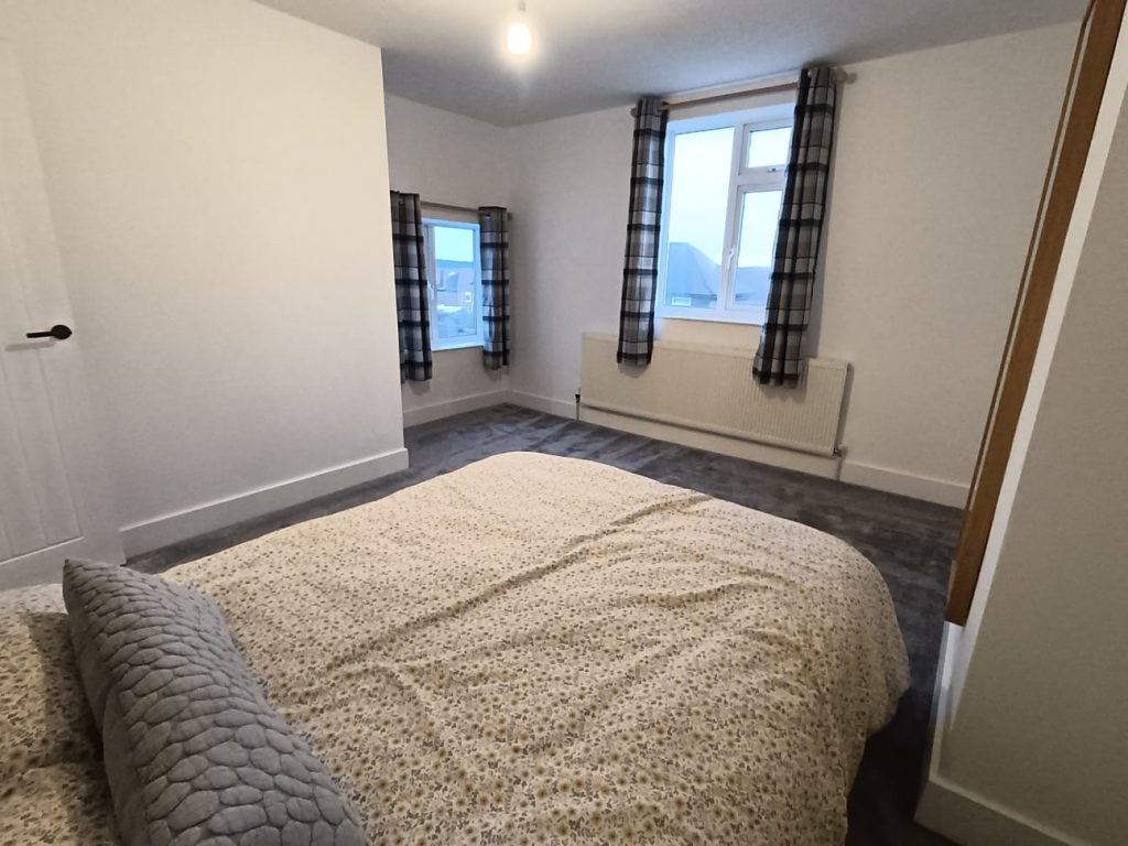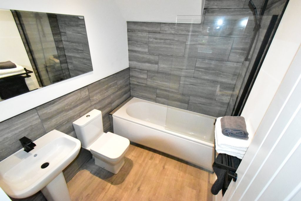Brand new fitted bathroom, white three piece suite comprising of a wash hand basin (with waterfall tap), W.C. and a bath with shower over, part wall tiling, UPVC double glazed window and ceiling light point.
