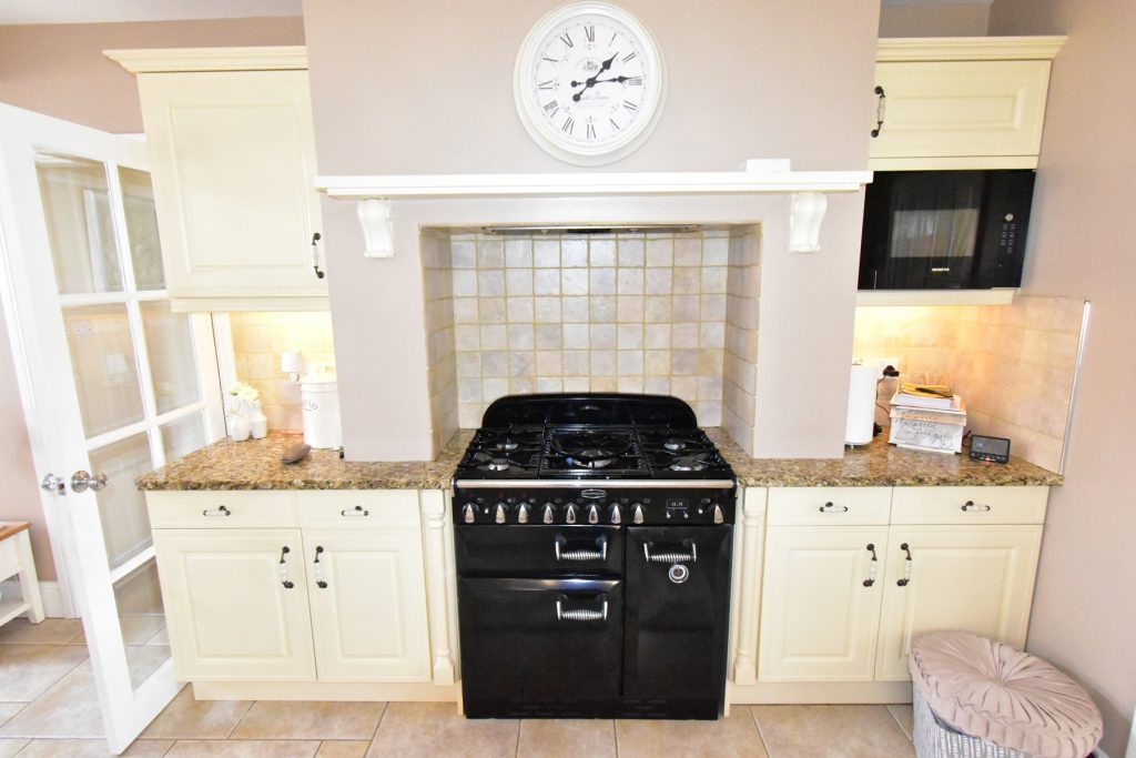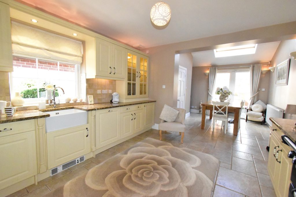 Fitted with a range of wall and base units in a cream finish with coordinating work surfaces, part wall tiling, space and plumbing for a fridge freezer, space and fittings for an oven, sink with mixer tap, window to the side, square archway into the dining room, radiator, power and ceiling light points.