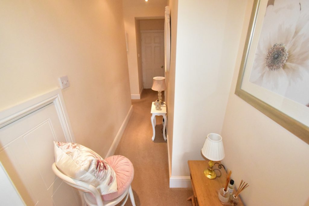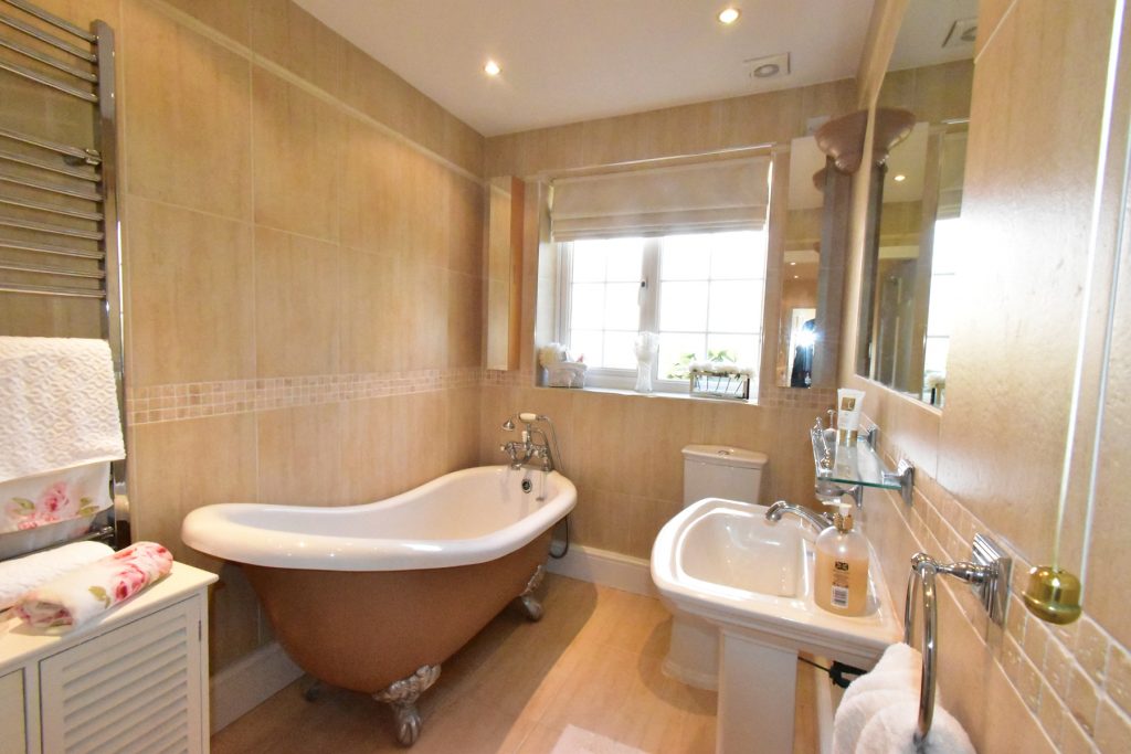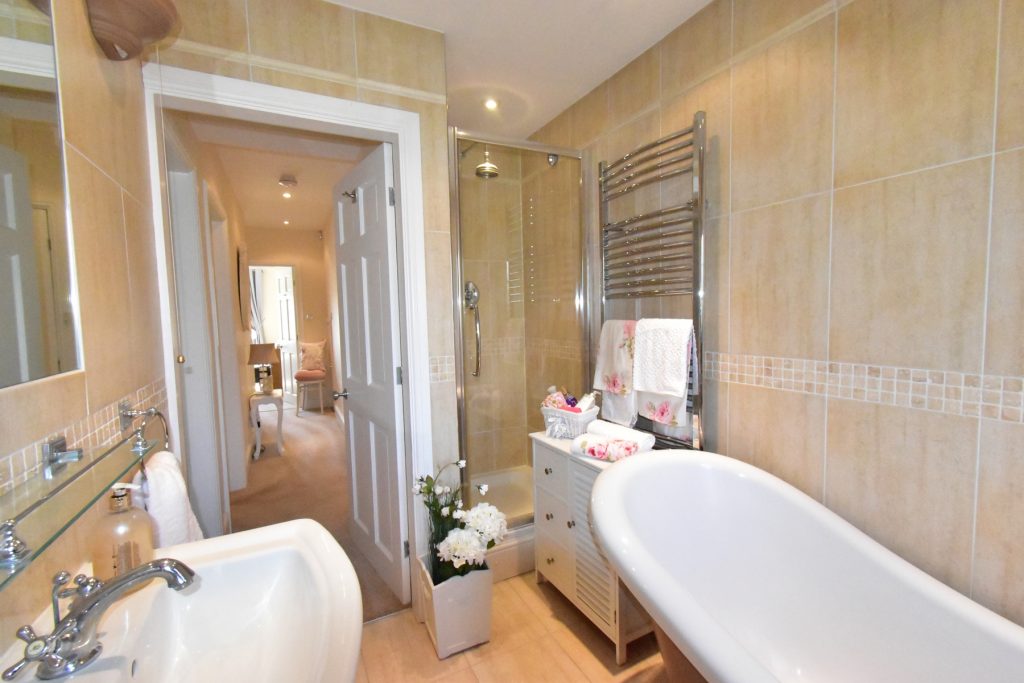 With window to the rear, freestanding bath, wash hand basin, W.C., separate shower cubicle, fully tiled walls, chrome towel radiator and ceiling light points.