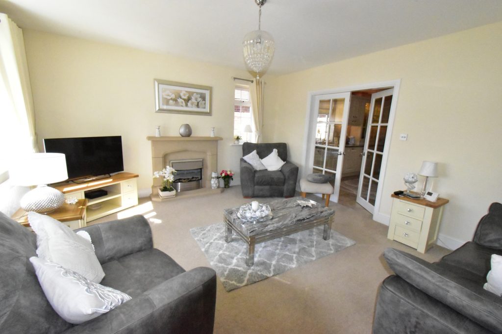 A spacious family room with windows to the front and side, feature fireplace, radiator, power and ceiling light points.