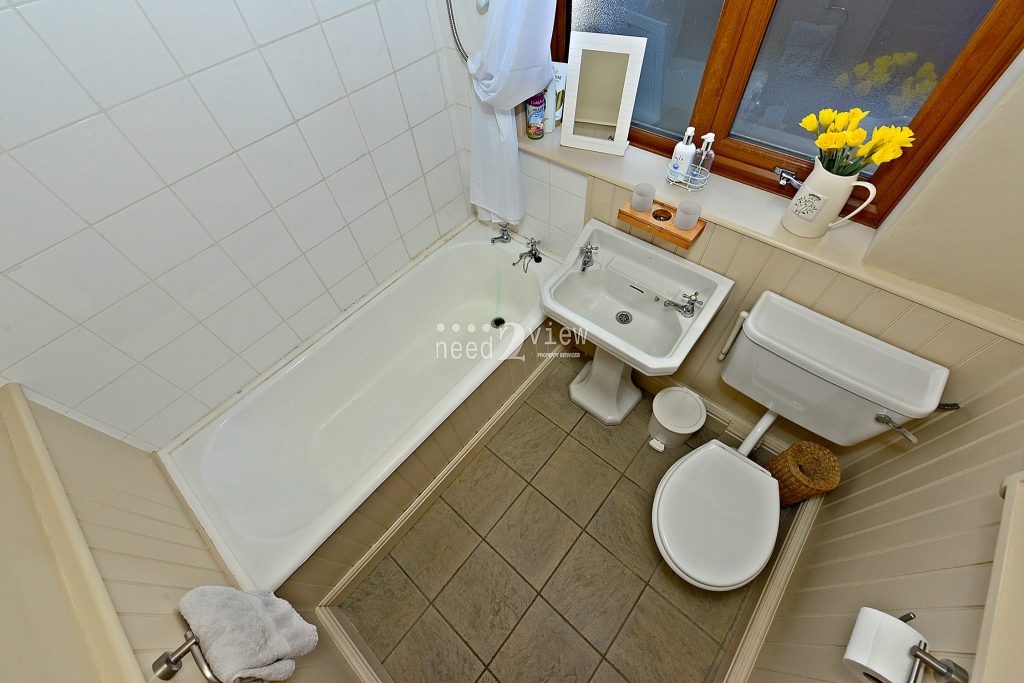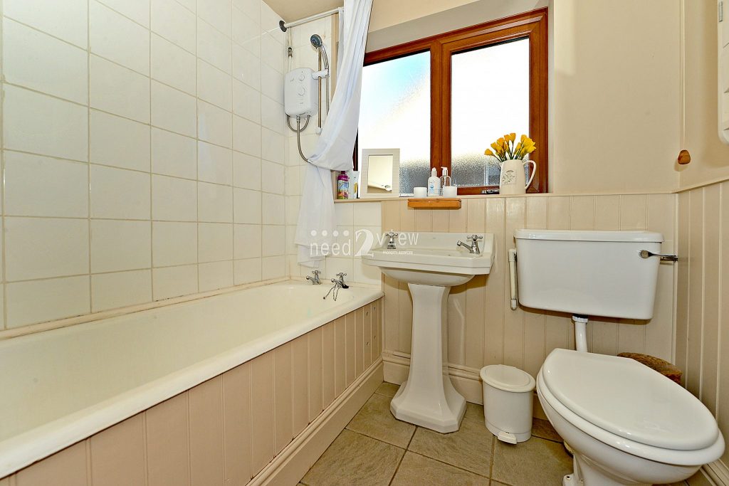 With three-piece white suite comprising panelled bath, pedestal wash hand basin, low flush W.C, electric shower over the bath, part wall tiling, double glazed opaque window to the side and chrome towel rail radiator.