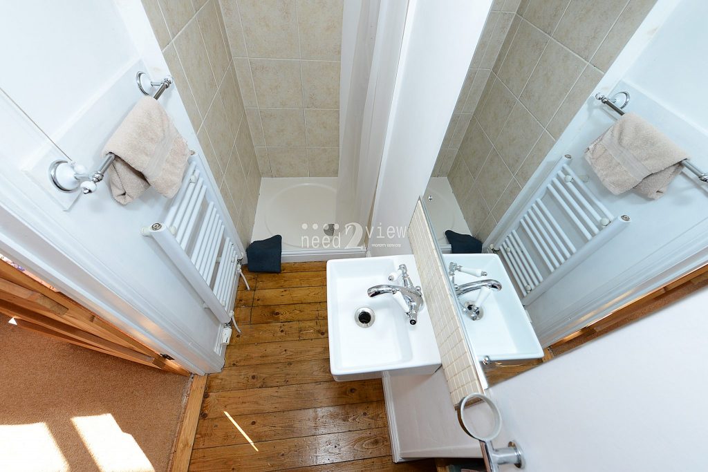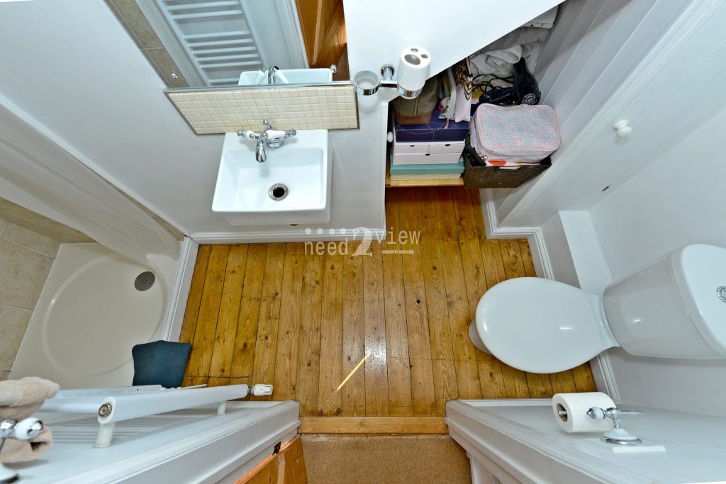 With wall mounted wash hand basin, closed coupled W.C, shower enclosure, thermostatically controlled towel rail radiator and built-in cupboard with shelving.
