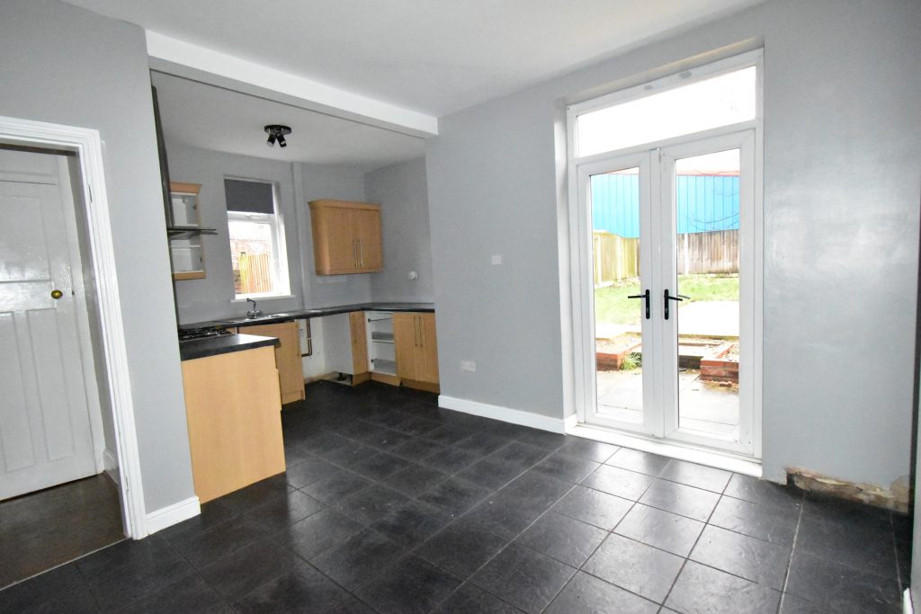 A range of wall and base units in a wood finish, coordinating work surfaces, integrated over, four ring gas hob, extractor fan, stainless steel sink one and a half bowl single drainer sink with mixer tap, UPVC double glazed window to the side, UPVC double glazed patio doors to garden, radiator, power and ceiling light points.