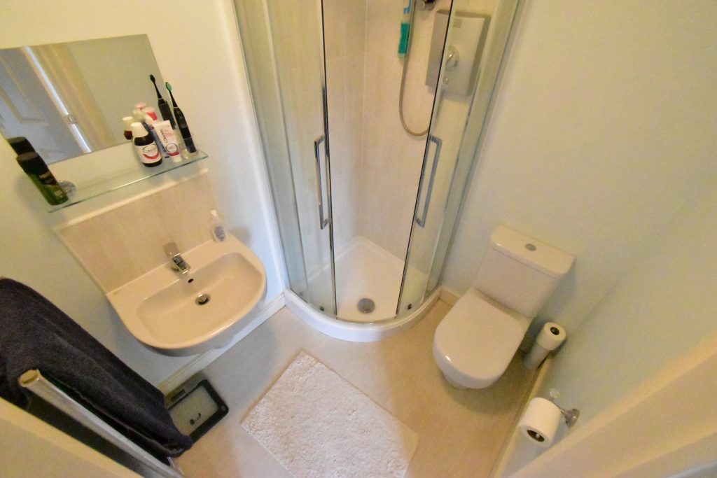With close coupled W.C, floating wash hand basin with tiled splash back, radiator, ceiling light point and UPVC double glazed opaque window to the side.