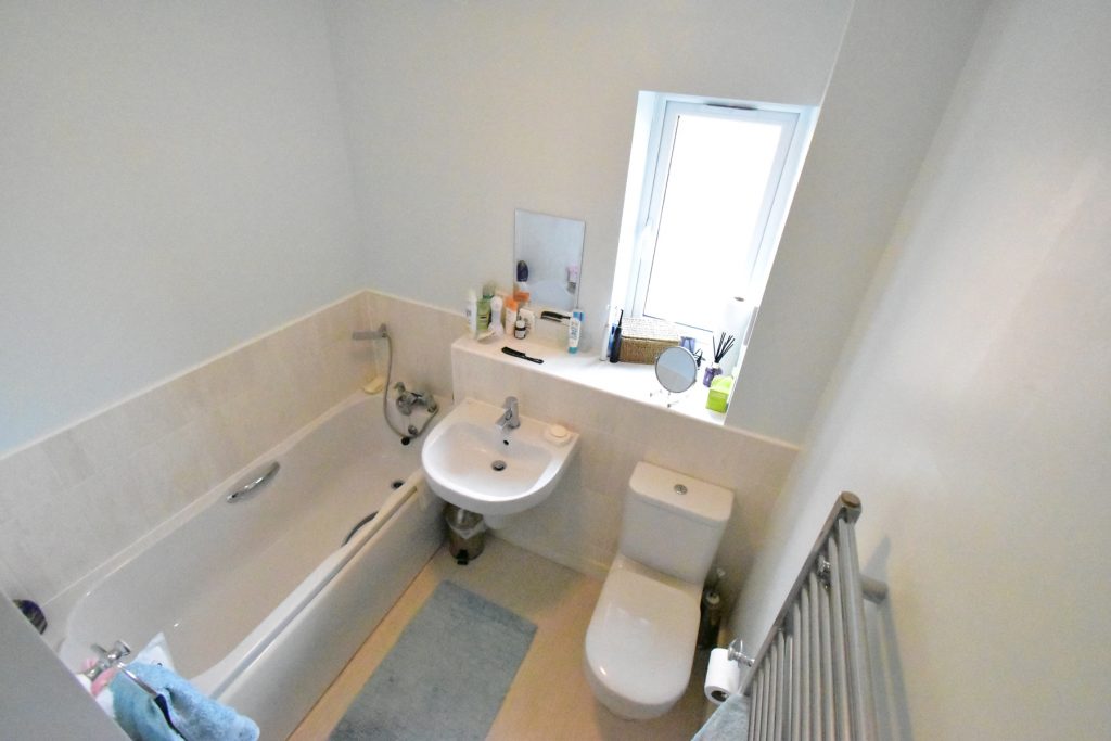 Fitted with a modern three-piece white suite incorporating panelled bath with shower head taps, close coupled W.C, and floating wash hand basin with chrome mixer tap. There is a UPVC double glazed opaque window to the side, partial wall tiling, chrome towel rail radiator and ceiling light point.