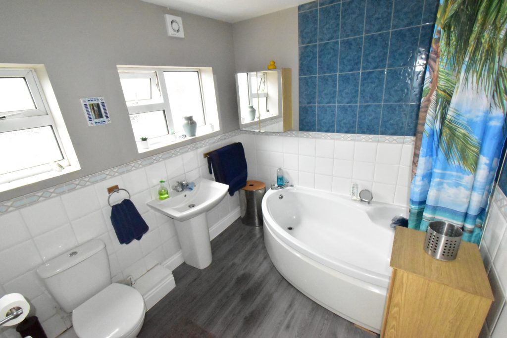 With windows to the side, white three piece suite comprising of a W.C., wash hand basin and bath, part tiled walls, chrome towel radiator and ceiling light point..