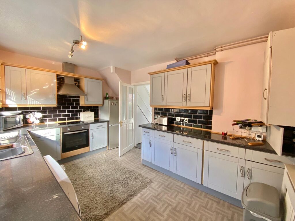 Fitted with a range of wall and base units in a grey finish with coordinating work surfaces, part wall tiling, space and plumbing for a fridge/freezer, space and plumbing for a washing machine, integrated oven, integrated four ring electric hob, extractor fan, one and a half bowl single drainer sink with mixer tap, window to the rear, door to the rear, radiator, power and ceiling light points.