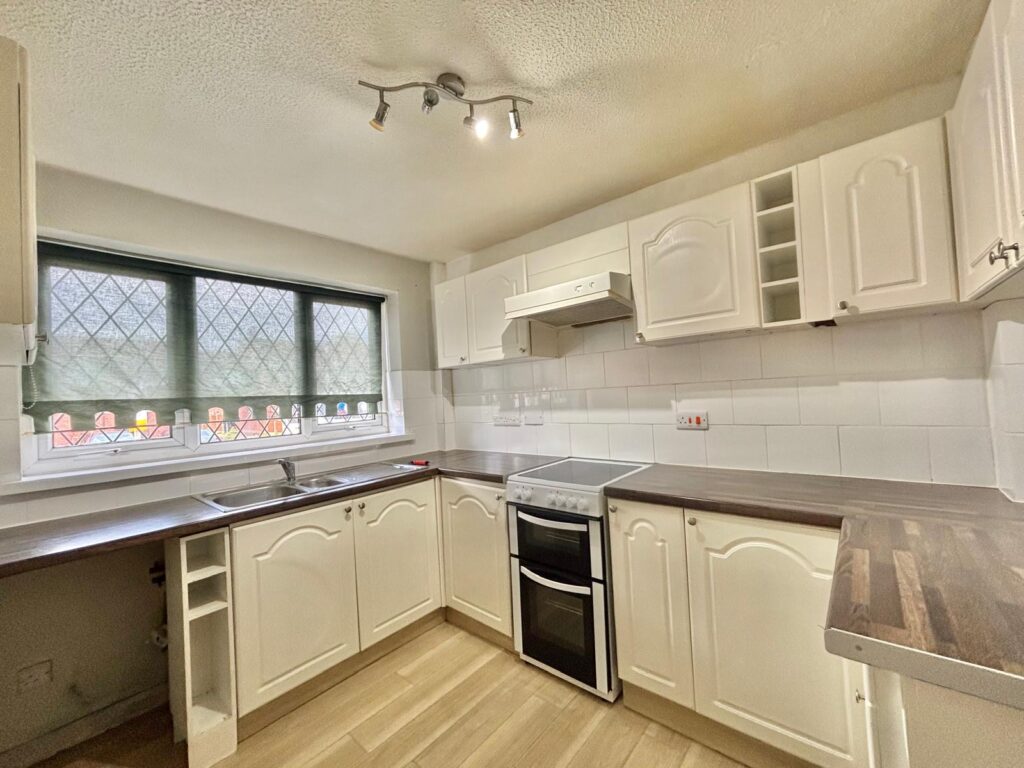 Fitted with a range of wall and base units in a white finish with coordinating roll top work surfaces, part wall tiling, space and plumbing for a washing machine, space and plumbing for a fridge freezer, space and fittings for an oven, extractor fan, one and a half bowl single drainer sink with mixer tap, UPVC double glazed window to the front, power and ceiling light points.