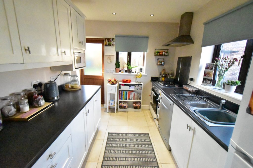 The kitchen has a range of wall and base units in white with black roll top work surfaces and coordinated tiling, stainless steel sink with mixer tap, integrated oven with extractor fan over, tiled flooring, power and ceiling light points.