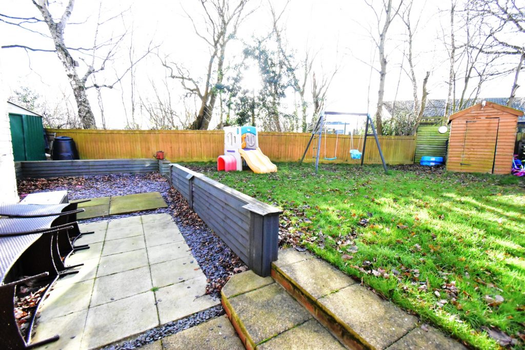 The large rear garden is enclosed with fencing and consists of a patio area directly outside the house with grass beyond and two sheds