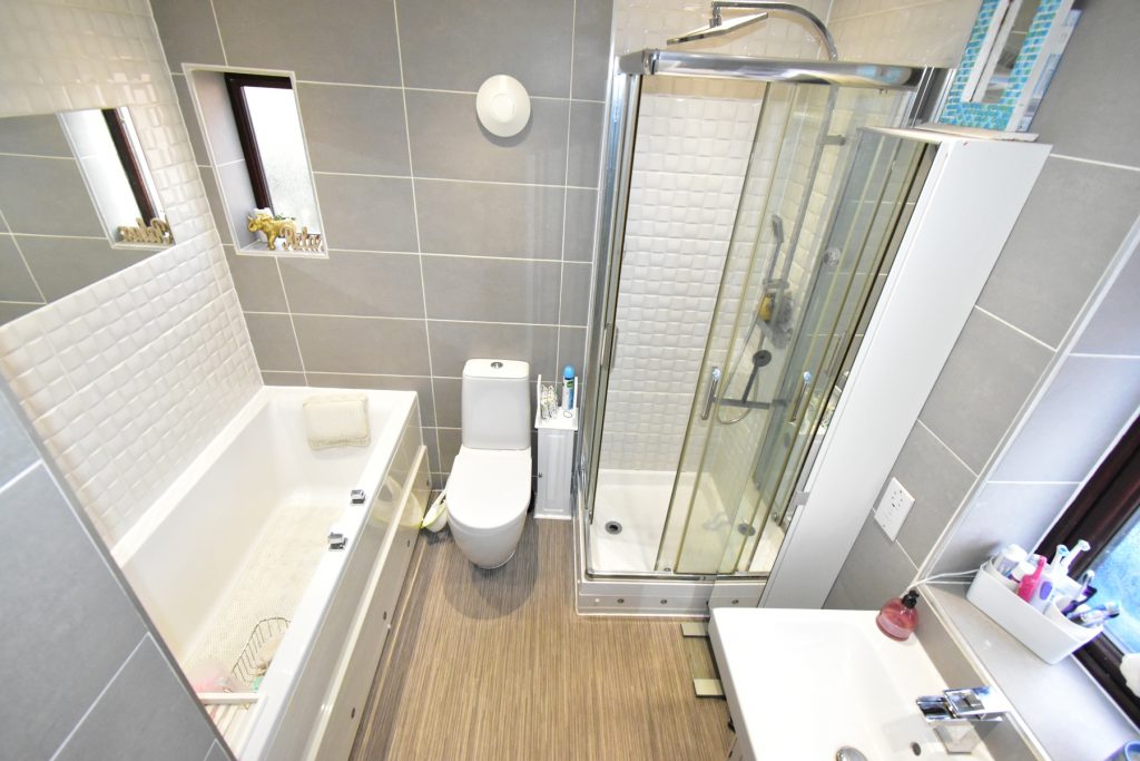 A modern bathroom comprising of a with three piece suite featuring a wash hand basin, close coupled W.C and panelled bath, there is a separate shower cubicle, two double glazed opaque windows, fully tiled walls, laminate flooring and radiator and ceiling light point.