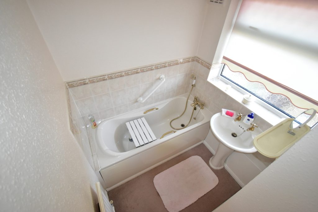 A panelled bath with shower head mixed taps. Pedestal wash hand basin. Part wall titling UPVC double glazed opaque window to the rear ceiling light point and radiator.