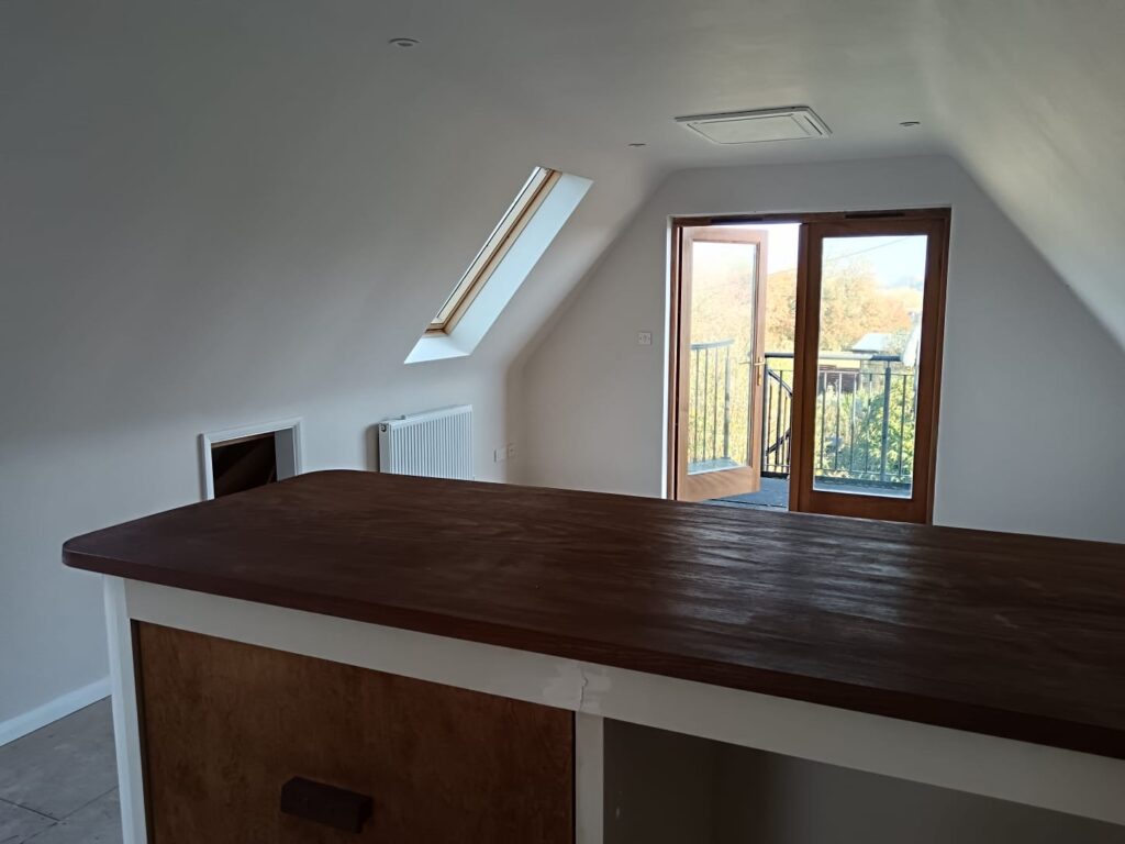 Large room with Velux roof windows, patio doors to balcony, radiator, power points and ceiling spotlights.