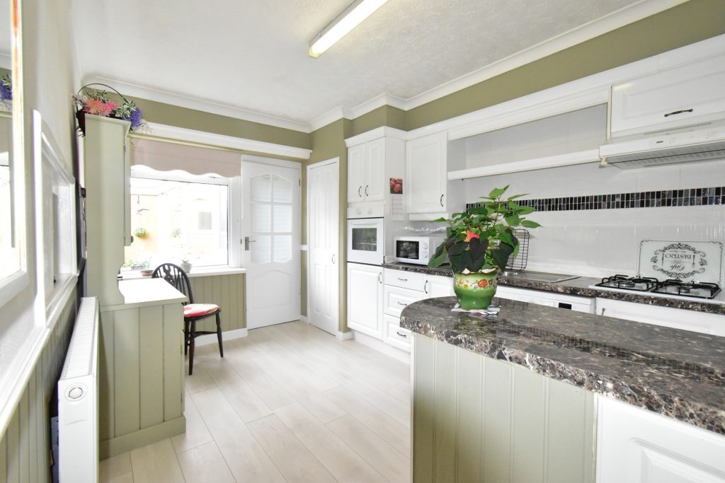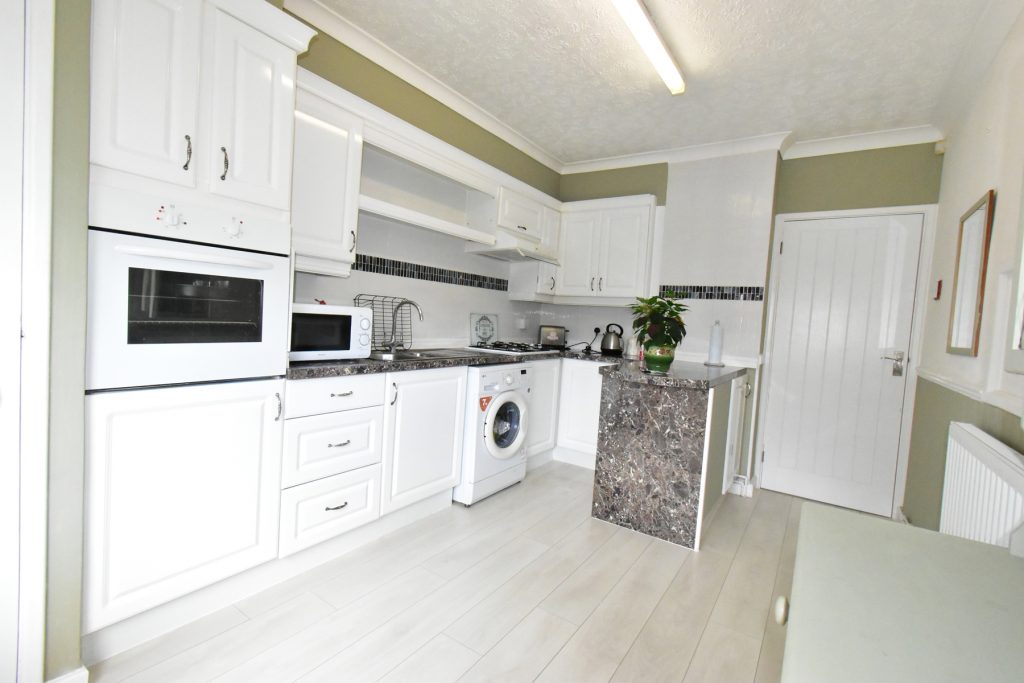 Fitted with a range of wall and base units in a white finish, coordinating work surfaces, part wall tiling, integrated oven, integrated four ring gas hob, space and plumbing for a washing machine, space and plumbing for a fridge/freezer, one and a half bowl single drainer sink with mixer tap, double glazed window to the rear, door to the rear, radiator, power and ceiling light points.