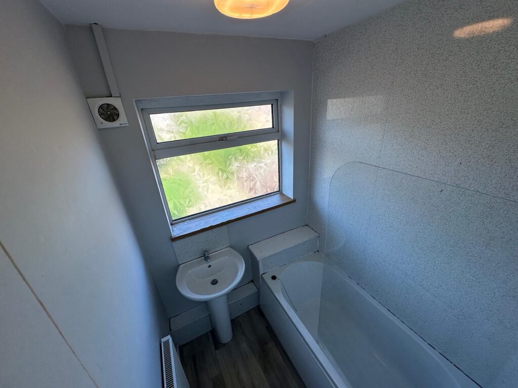 White suite comprising of a wash hand basin and bath with shower over, part panelled walls, UPVC double glazed window to the rear, radiator, power and ceiling light point.