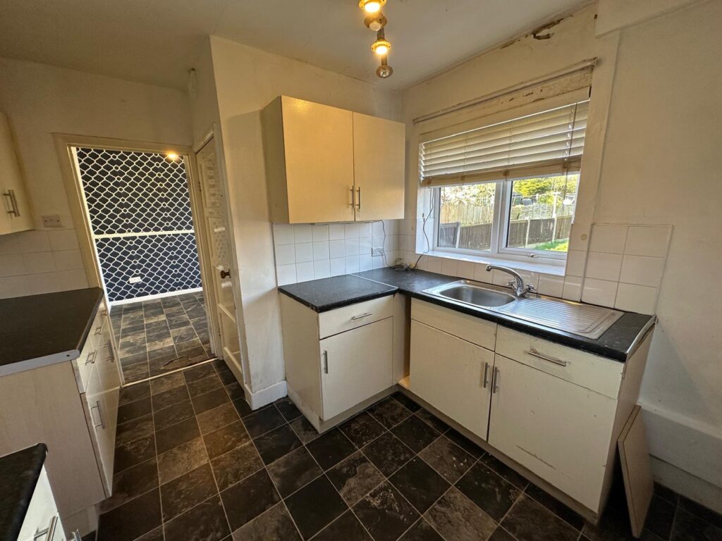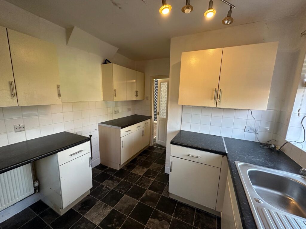 Fitted with a range of wall and base units in a cream finish with coordinating work surfaces, part wall tiling, space and plumbing for a washing machine, space and plumbing for a fridge freezer, space and fittings for an oven, single drainer sink with mixer tap, UPVC double glazed window to the rear, UPVC door to the rear, power and ceiling light points.