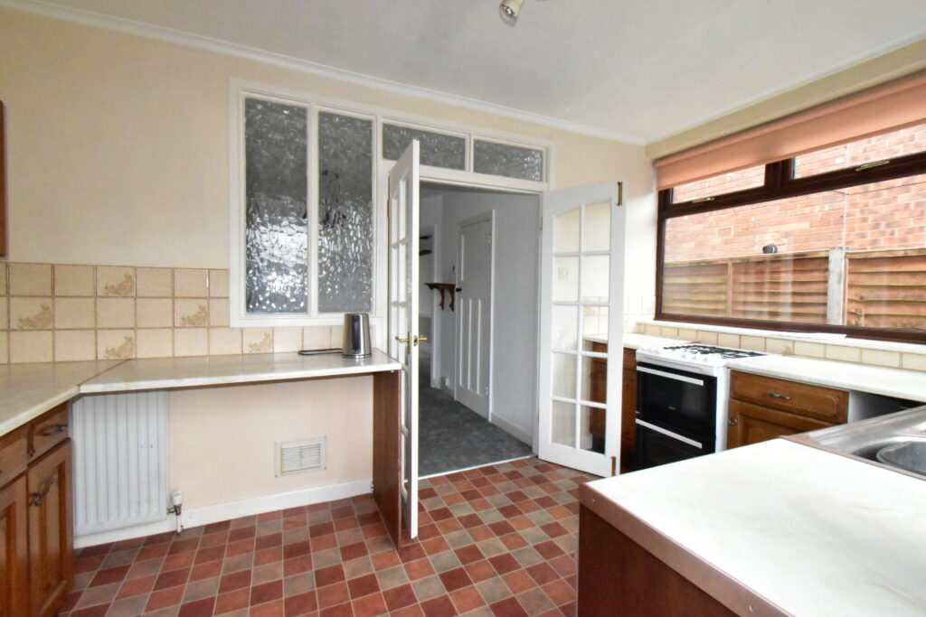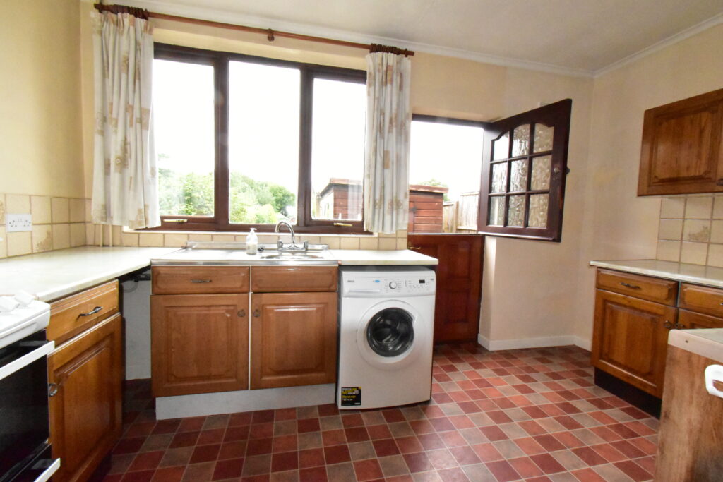 Fitted with a range of wall and base units in a wood finish with coordinating work surfaces, part wall tiling, space and plumbing for a washing machine, space and plumbing for a fridge freezer, single drainer sink with mixer tap, windows to the side and rear, door to the rear, radiator, power and ceiling light points.