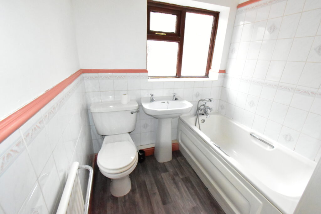 White three piece suite comprising of a wash hand basin, W.C. and bath, part tiled walls, opaque window, radiator and ceiling light points.