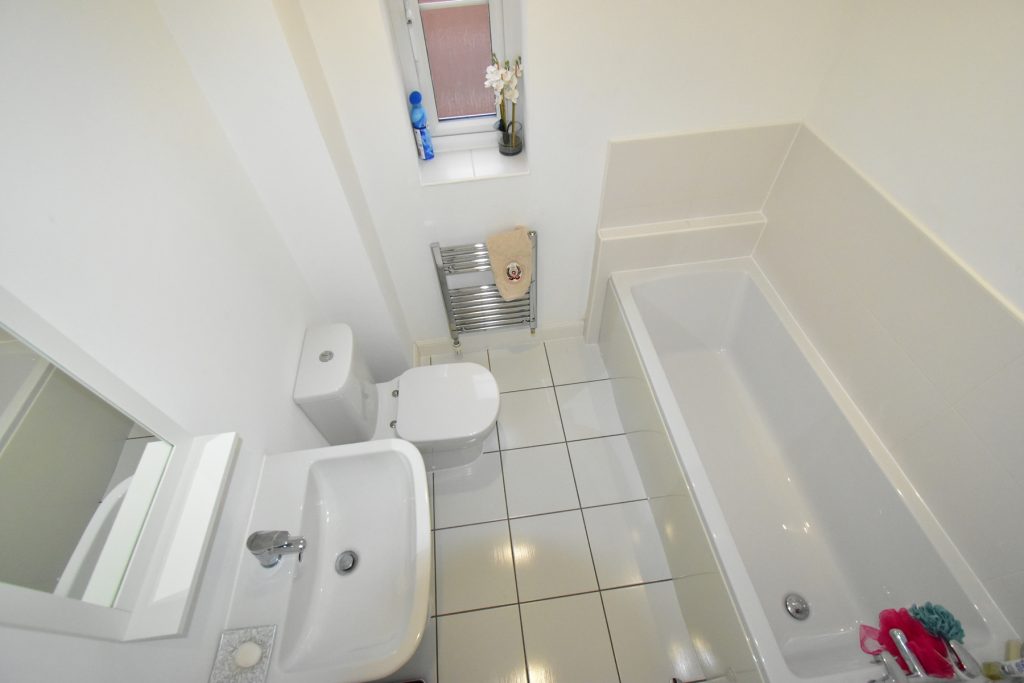 With UPVC double glazed opaque window to the side of the property, with white three piece suite comprising of a bath, wash hand basin, W.C, part tiled walls, chrome towel radiator and ceiling light point.