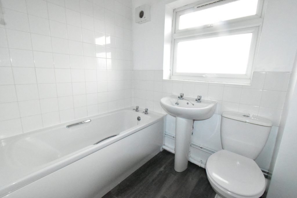 With a white three piece suite comprising of a wash hand basin, W.C. and bath, part tiled walls, window, radiator and ceiling light point.