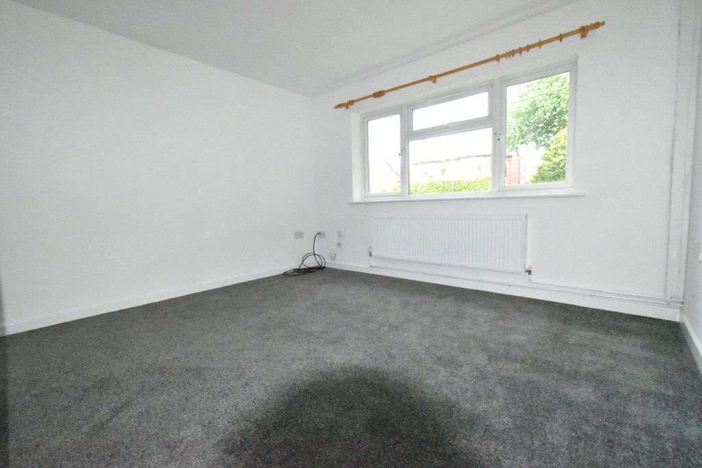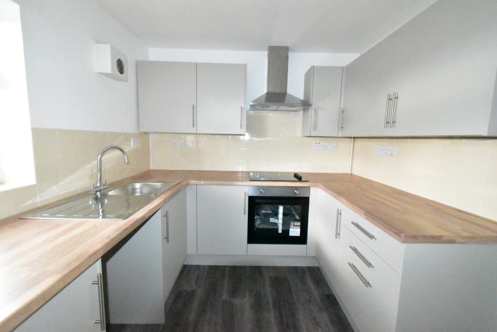 Fitted with a range of wall and base units in a grey finish with coordinating work surfaces, part wall tiling, space and plumbing for a washing machine, space and plumbing for a fridge freezer, integrated oven, four ring electric hob, extractor fan, single drainer sink with mixer tap, window, radiator, power and ceiling light points.