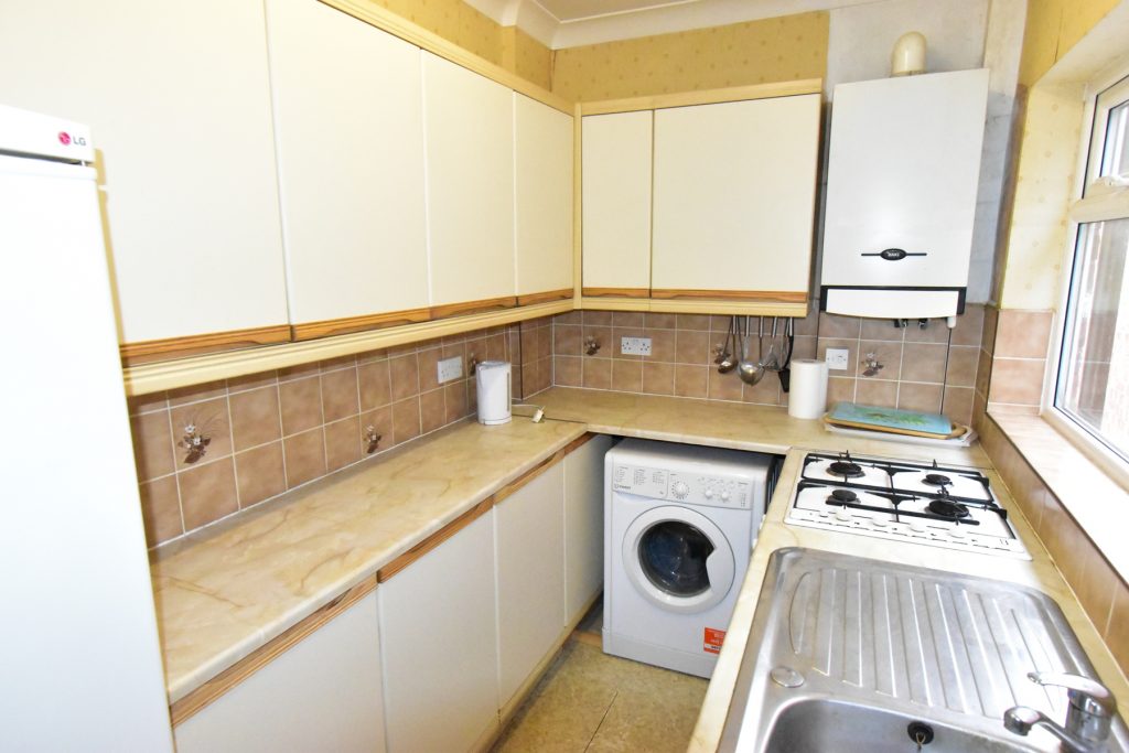 Fitted with a range of wall and base units in a white and wood finish with coordinating work surfaces, part wall tiling, space and plumbing for a washing machine, space and plumbing for a fridge freezer, integrated electric oven, four ring gas hob, single drainer stainless steel sink with mixer tap, double glazed window to the side, baxi combi boiler, radiator, power and ceiling light points.