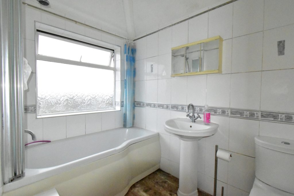 White three piece suit comprising of a close coupled W.C., wash hand basin, panelled bath with shower over, double glazed opaque window, fully tiles walls, radiator and ceiling light point.