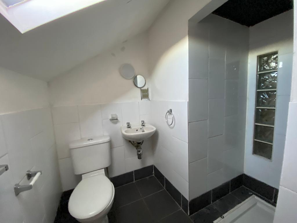 With Velux roof window to the rear, part tiled walls, wash hand basin, W.C., shower cubicle, towel rail and ceiling light point.
