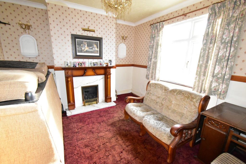 A good sized family room with a window to the rear, feature fireplace, radiator, power and ceiling light points.