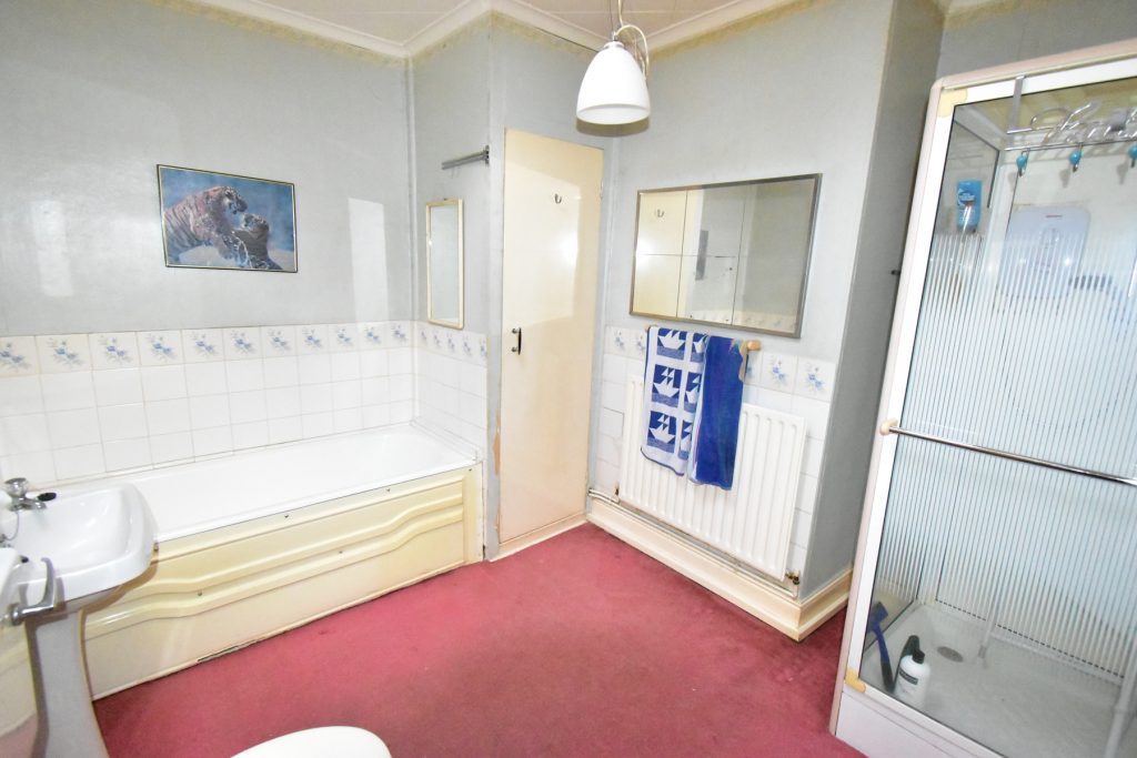 With window to the rear, bath, W.C., wash hand basin, separate shower cubicle, part tiled walls, radiator and ceiling light point.