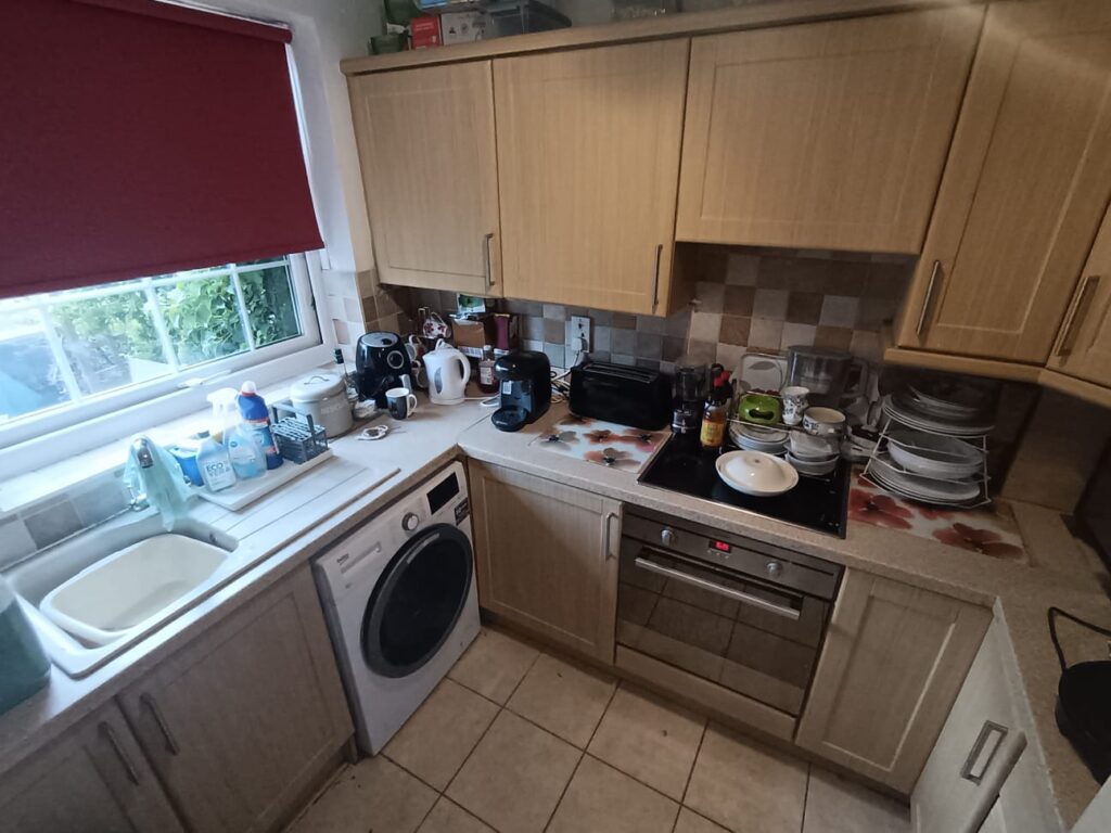 work surfaces, part wall tiling, space and plumbing for a washing machine, space and plumbing