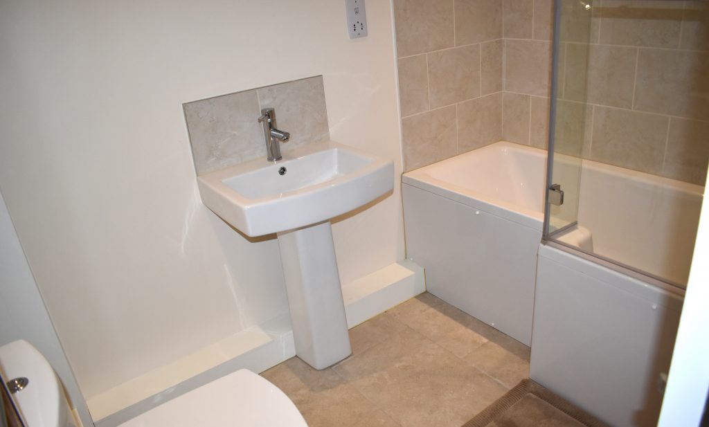 With three-piece white suite comprising panelled bath with shower over, wash hand basin and close coupled W.C., ceiling spot lights, twin voltage shower point, chrome towel rail radiator, ceramic floor tiles, part wall tiling and extractor fan.