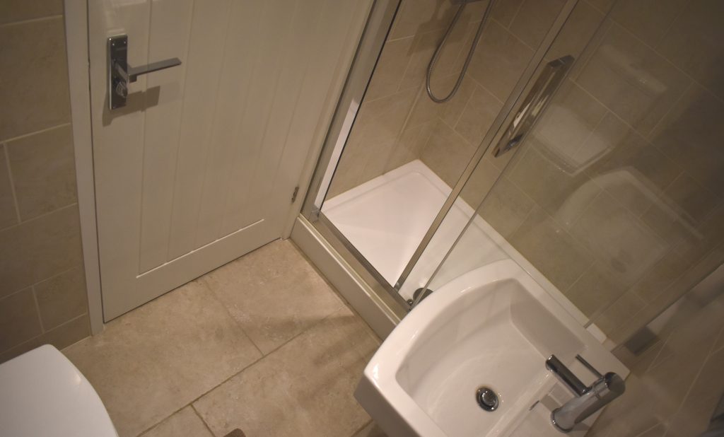 With three-piece white suite comprising double shower, wash hand basin and close coupled W.C. There are ceiling spot lights, a twin voltage shower point, chrome towel rail radiator, ceramic wall and floor tiling and extractor fan.