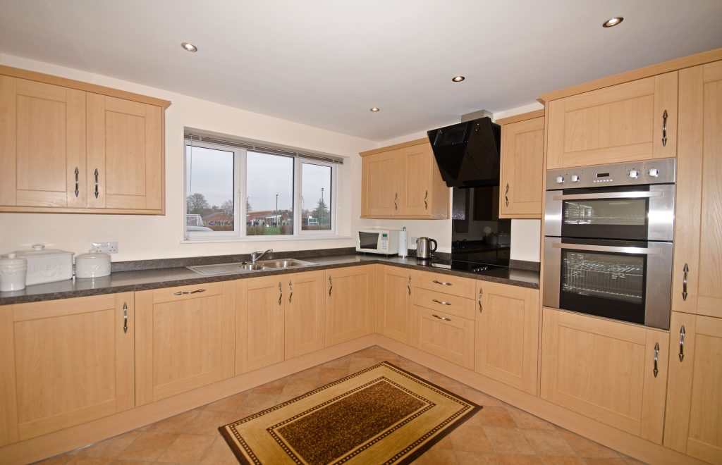 Which has a range of attractive wall and base units with a multitude of integrated appliances to include fridge-freezer, dishwasher, washer-dryer, double oven and grill and electric hob with extractor over. There is a 1 ½ bowl stainless steel sink set under UPVC double glazed window overlooking the front, part wall tiling, tiled splash back, ceiling spot lights and numerous power points.
