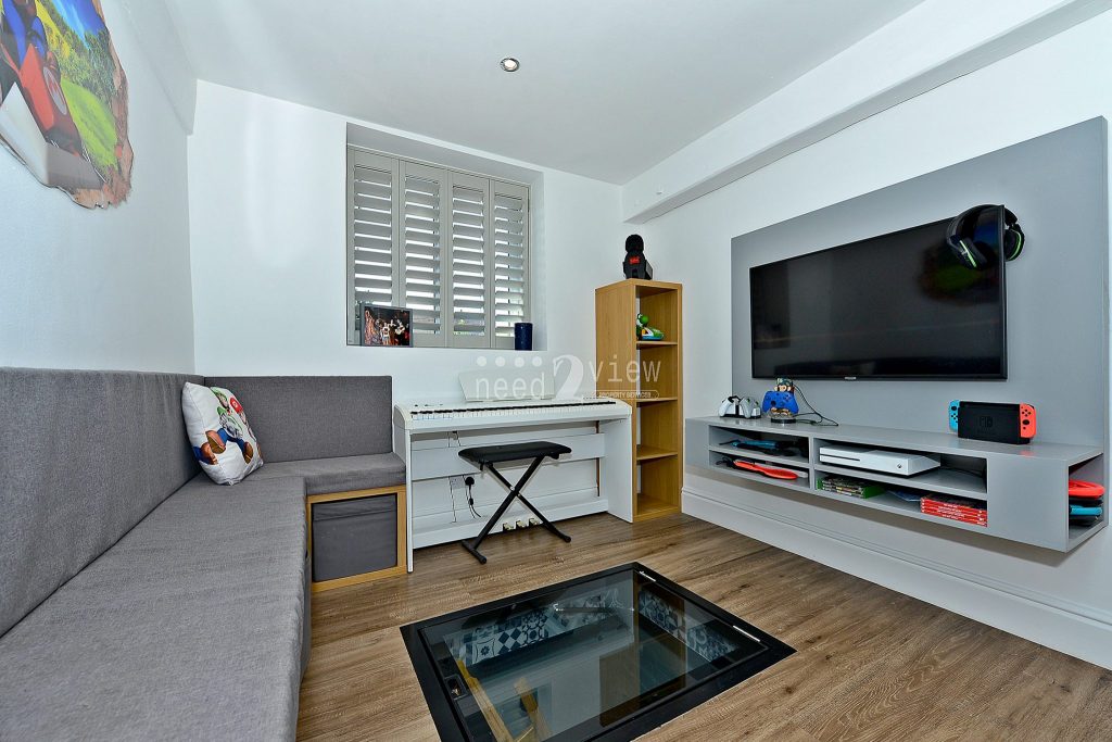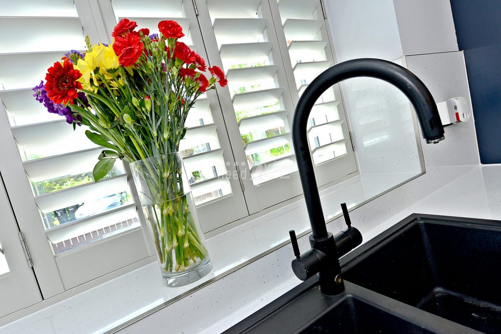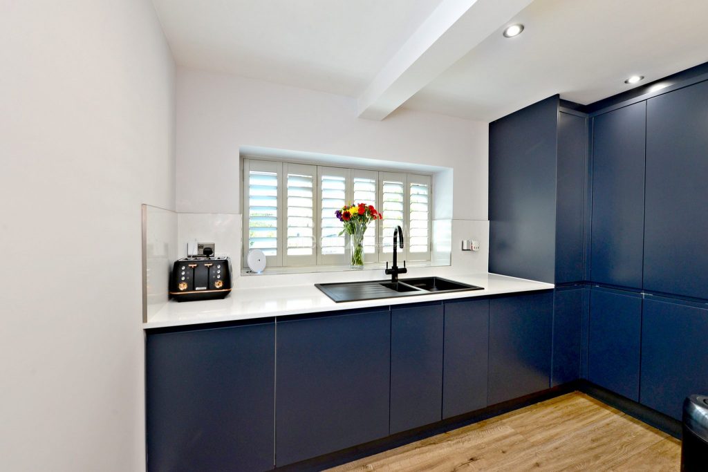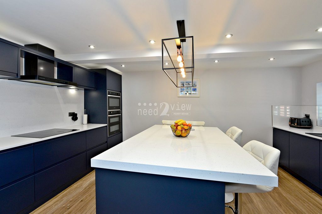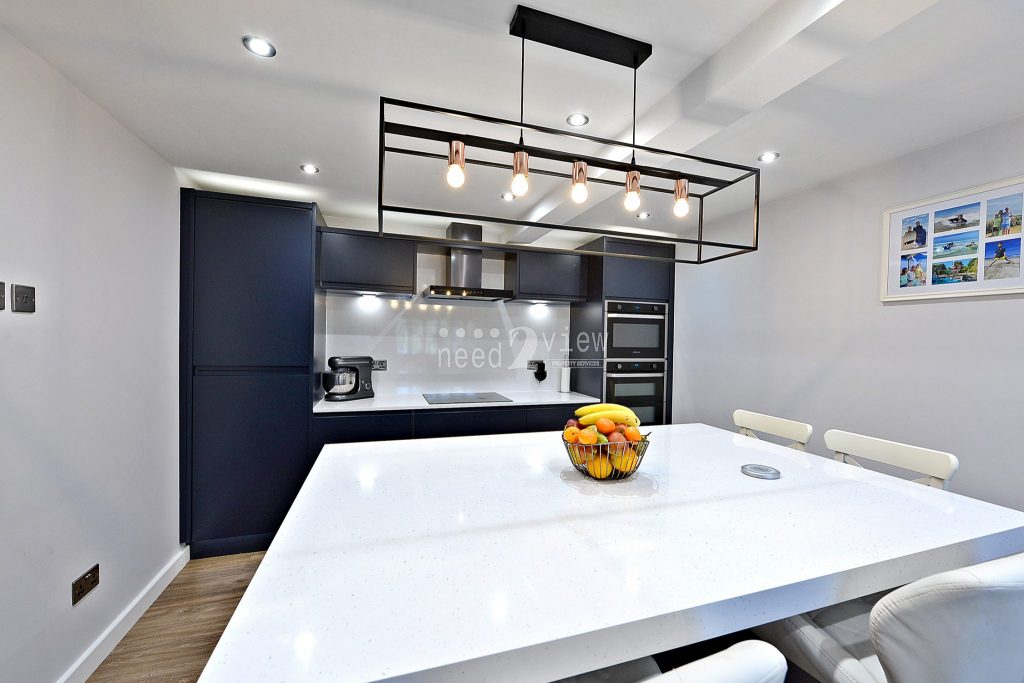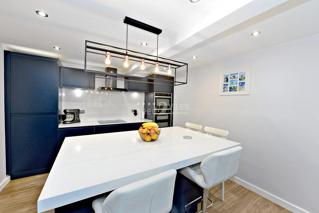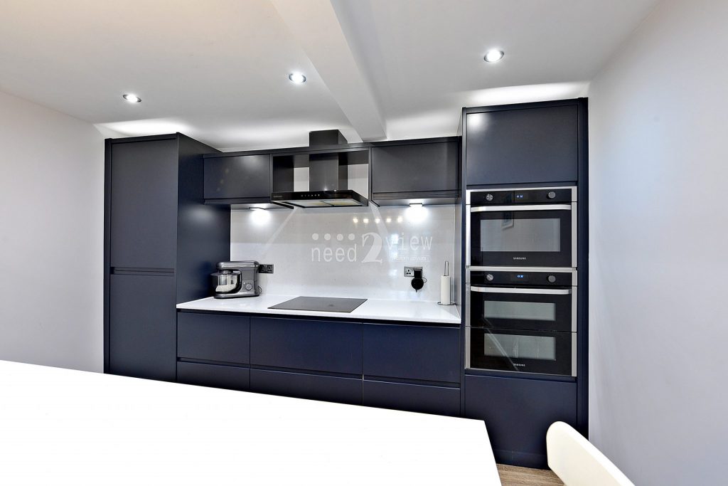 Fitted with a range of wall and base units in a black finish with coordinating work surfaces, part wall tiling, integrated fridge/freezer, integrated dishwasher, integrated washing machine and dryer, wine fridge, induction hob, extractor fan, Samsung Wi-Fi oven, composite sink with ‘hot’ tap and cold water chiller, window, power and ceiling light points.