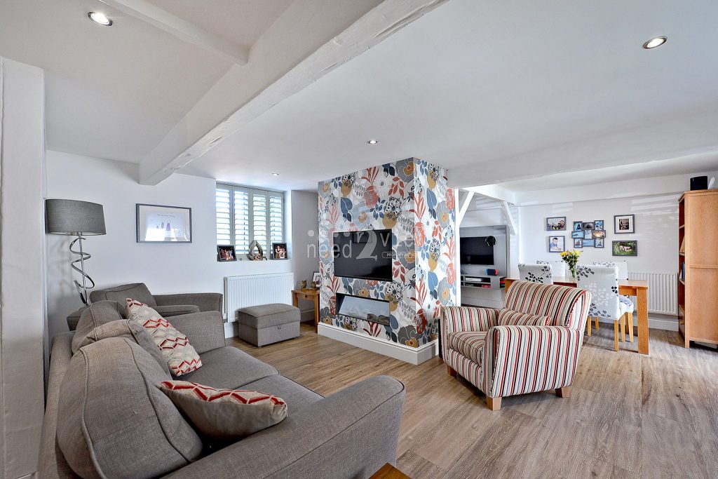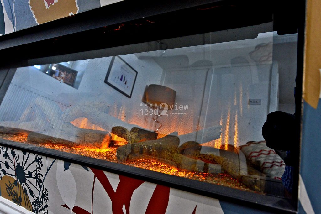 A spacious family room with double glazed windows with internal shutters to the front, double glazed window to the rear, modern fireplace, radiator power and ceiling light points.