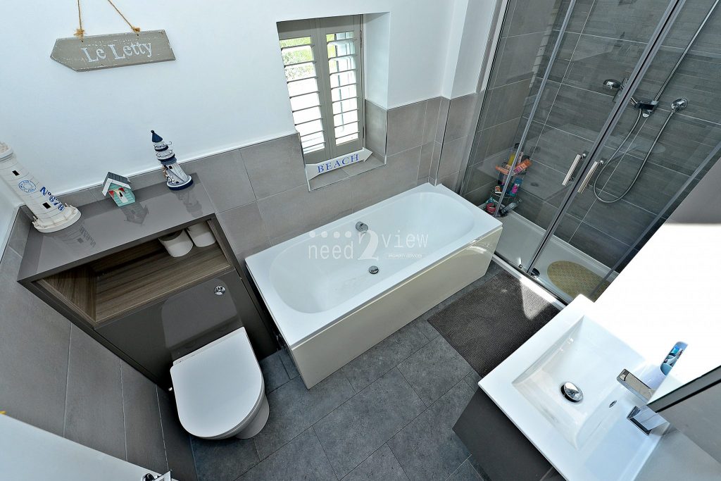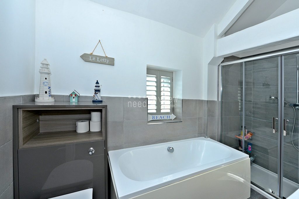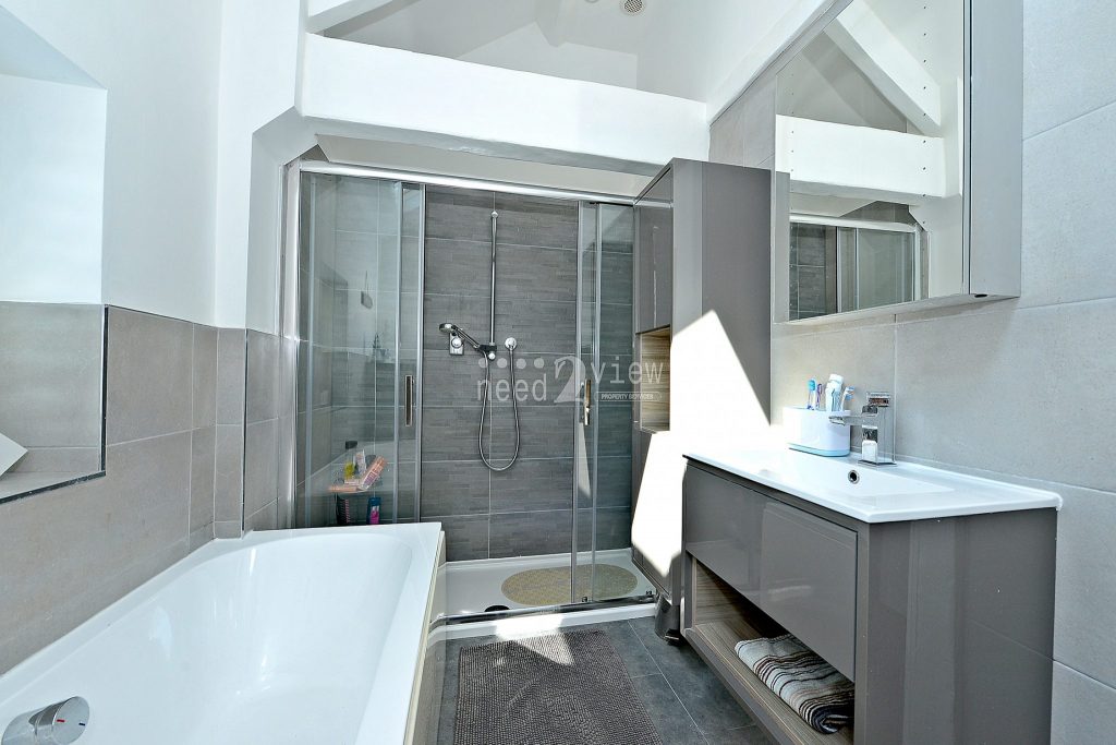 White three piece suite comprising of a wash hand basin, W.C., bath and a separate shower cubicle, part tiled walls, double glazed window to the front with internal shutters, vaulted ceiling, radiator and ceiling light point.